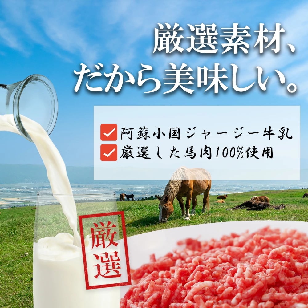 馬肉(カナダ産・国内産)、玉葱、小麦粉(国内製造)、植物性ショートニング、イースト、食塩、ぶどう糖、乳加工品、大豆粉/イーストフード、ビタミンC、牛乳(熊本県産)、卵、食用植物油脂(国内製造)食用精製加工油脂、乳化剤、香料、着色料(カロテン)、