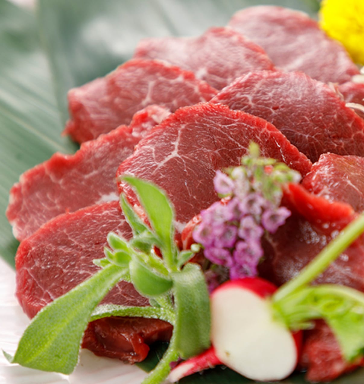 一頭から僅かしか採れない、赤身の希少部位。新鮮な馬ヒレは軟らかさと赤身のあっさりした味わいが口の中に広がります。馬刺しだけでなく、焼く事で柔らかな食感を楽しめる馬レアステーキなどもおすすめです。